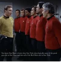 The stormtroopers fire at the Red Shirts despite the fact they cannot hit the broadside of a barn. In Fridays Child one of the more-blatant Cold War-parable episodes an Enterprise away team beams down to Capella Four in the hopes of setting up the Topaline mining agreementUnfortunately a Klingon named Kras is already there working on a deal and hes got. A funny Star Trek red shirt meme shows the importance of wearing face masks amid the COVID-19 pandemic.